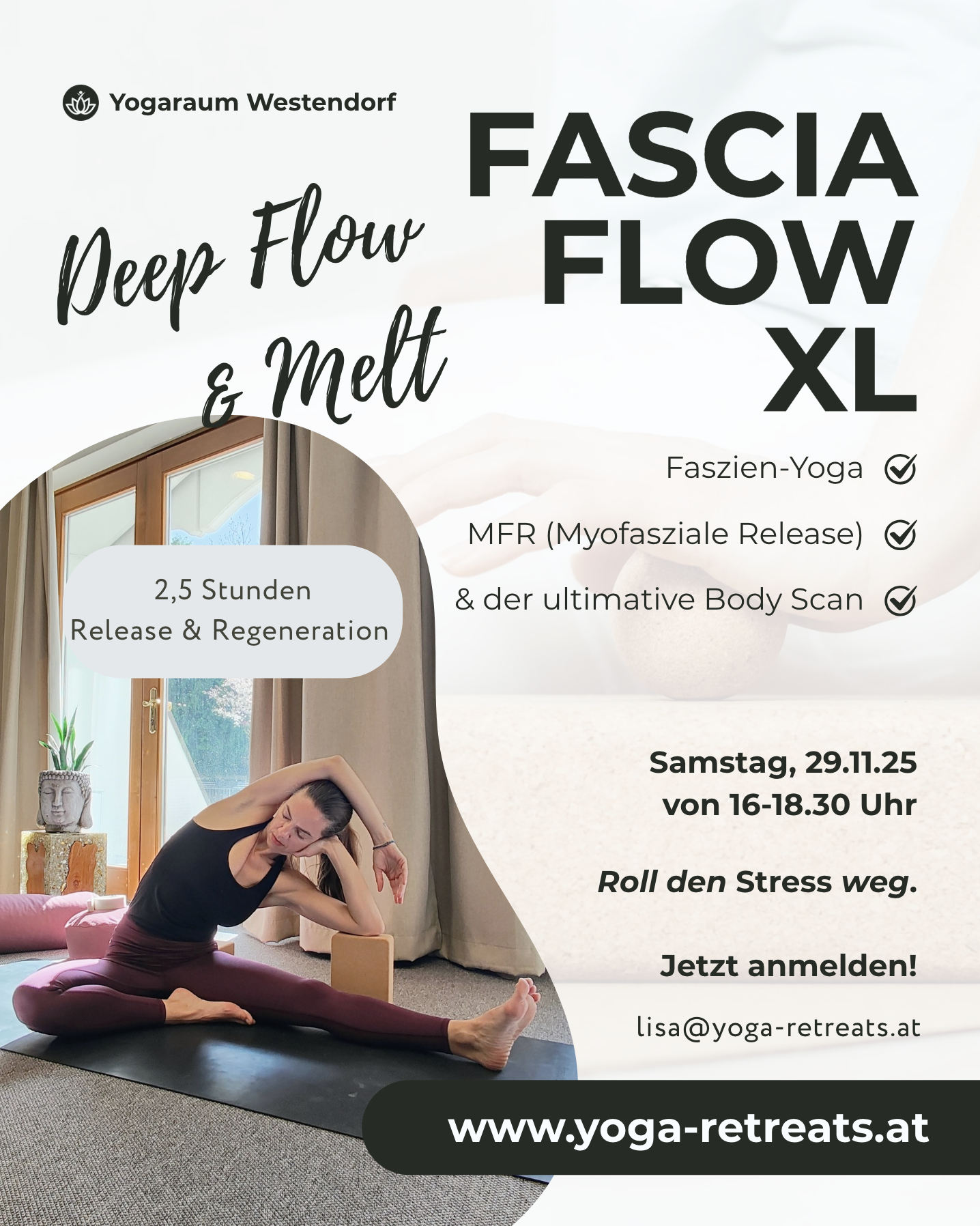 In diesem XL-Workshop kombinieren wir fließendes Faszien-Yoga mit gezielter Myofaszialer Entspannung (MFR), um tief sitzende Verspannungen in Deinem Bindegewebe zu lösen. Wir nutzen Tennisbälle und Handtücher als Hilfsmittel, um Blockaden in Hüften und Schultern zu schmelzen. Den krönenden Abschluss bildet der Ultimative Body-Scan, der Deinen Körper und Geist in einen Zustand tiefer Stille führt. Abgerundet mit gemütlichem Tee-Beisammensein für Austausch und Verbindung.